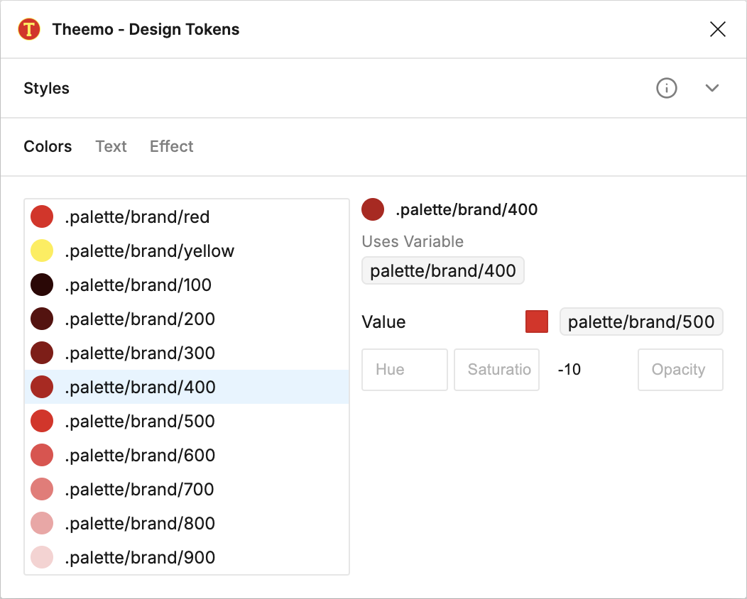 Theemo can apply transform operations to color variables, currently to change hue, saturation, lightness and opacity.